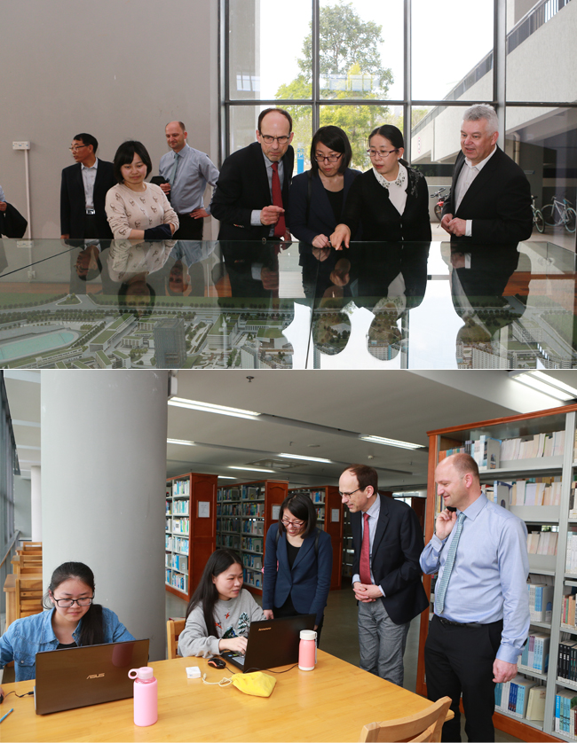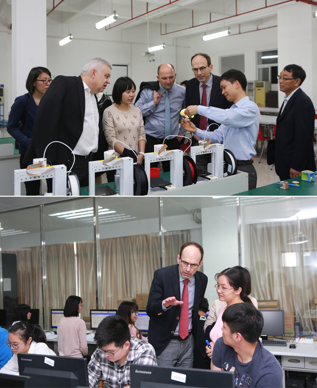 座谈后,德国代表团一行参观了校园,并详细考察了机电工程学院、电子与通信学院的实验实训室建设与实施情况。德方表示,我校的硬件设施与软件投入给代表团成员留下了极其深刻的印象。