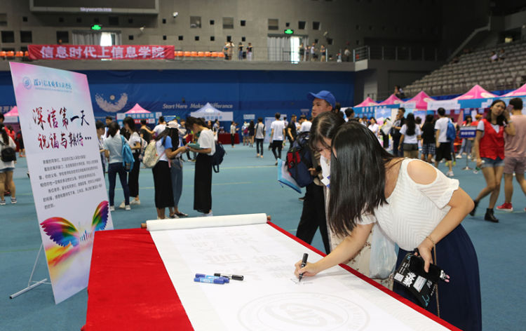昨日上午,榜样君在校园感受到热烈、井然有序的迎新气氛。新生报到处设在体育馆,不少新生在“深信第一天”留言台写下对大学生活的祝福与期待。