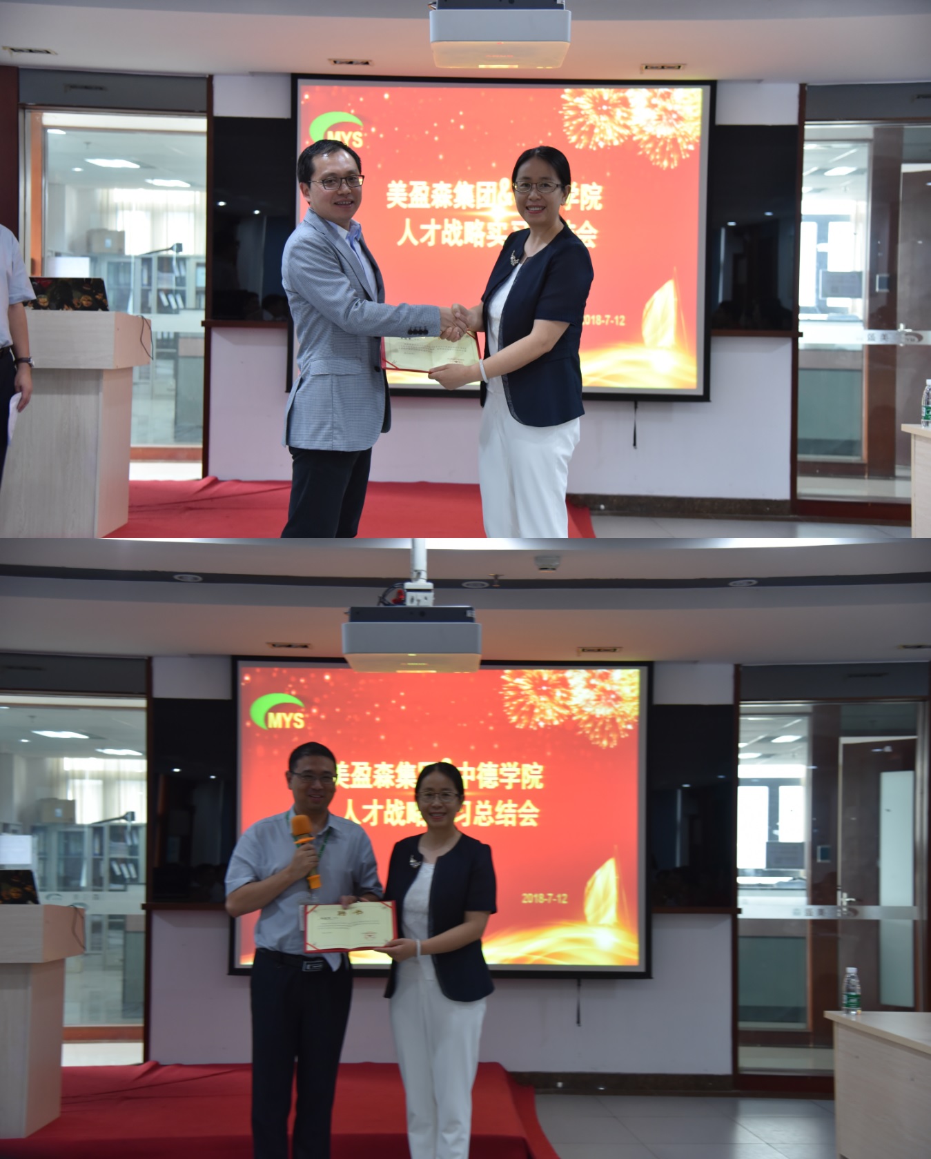 实习总结会由美盈森集团人力资源部王发利总监主持。王总监从企业文化融入、现场实训、专业知识培训和实习总结等方面介绍了实习概况,赞扬了实习生饱满的精神状态和艰苦奋斗的工作作风。实习岗位所在工厂的甄爱国厂长进行了实习点评,高度肯定了实习生的吃苦耐劳精神与动手操作能力。实习学生代表倪星和毛玮文等做了实习感言,感谢学院和公司给了难得的实习机会,增长了见识,提高了动手能力,也发现了自身的不足,将在后续学习中加倍努力提升自身素质。王治军总经理高度肯定了中德学院人才培养质量,集团将继续与中德学院开展深入合作,进一步探讨现代学徒制人才培养,培养符合中国制造2025要求的技能人才。周彦兵院长感谢公司的大力支持,高质量完成第一次学生实训,祝贺30名实习生圆满完成实习任务。周彦兵院长给王治军总经理等颁发企业兼职教师聘书,给李辉莹经理等颁发了优秀实习指导教师荣誉证书。最后,中德学院实习生进行了合唱、舞蹈等文艺汇演,展示了中德学子的才艺风采。