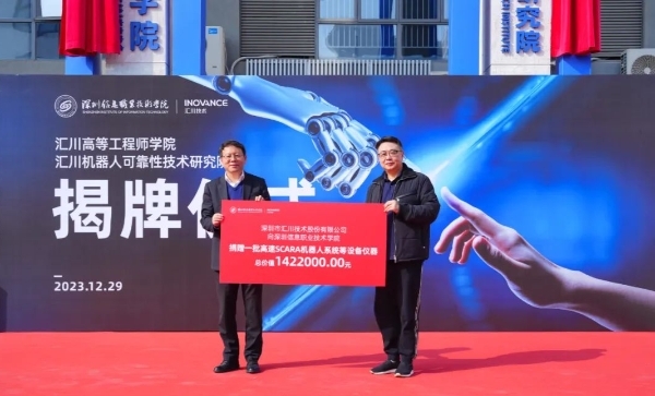 仪式上,我校与汇川、深圳市教育局职业与终身教育处、深圳市科创委科技重大专项处、深圳市工信局装备工业处等单位的相关领导,共同为“汇川高等工程师学院”和“汇川机器人可靠性技术研究院”揭牌。揭牌仪式后,汇川董事长朱兴明代表汇川向我校捐赠了一批价值142.2万元的高速SCARA机器人系统等设备仪器,我校党委书记苗宁礼代表学校接受汇川的捐赠。