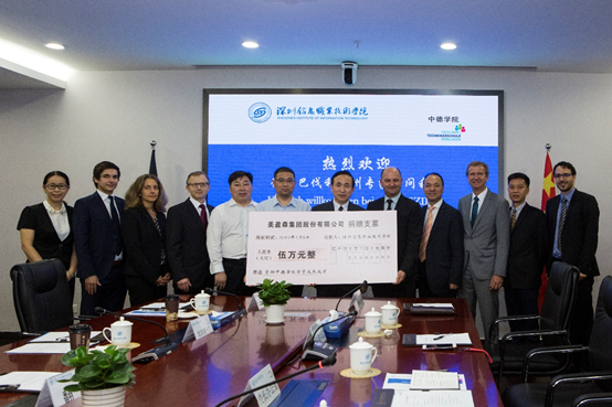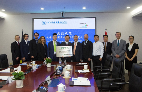 之后举行的KEBA机器人教育学院授牌仪式和美盈森公司捐赠仪式中,孙湧校长代表学校接牌与接收企业捐款,布罗伊校长等德方代表团一行共同见证了中德学院校企合作授牌仪式与捐赠仪式,并合影留念。